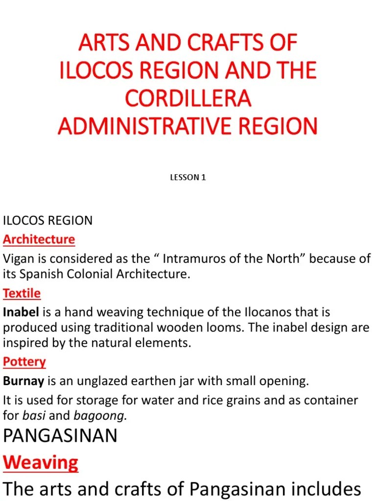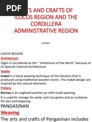 Means to make cloth and other objects. Handicrafts,waving and pottery traditional ilocano handicrafts, like the "inabel" fabrics & "burnay" jars are folk arts that continue to tell its tales for many hundred years now. Means to make cloth and other objects. Arts and crafts of the ilocos region and the cordillera administrative region (car) arts and crafts are important means of expressions , which communicate views, ideas and feelings through the use of skills and imaginations. The regional center is the chartered... Arts and crafts of the ilocos region and the cordillera administrative region (car) arts and crafts are important means of expressions , which communicate views, ideas and feelings through the use of skills and imaginations.